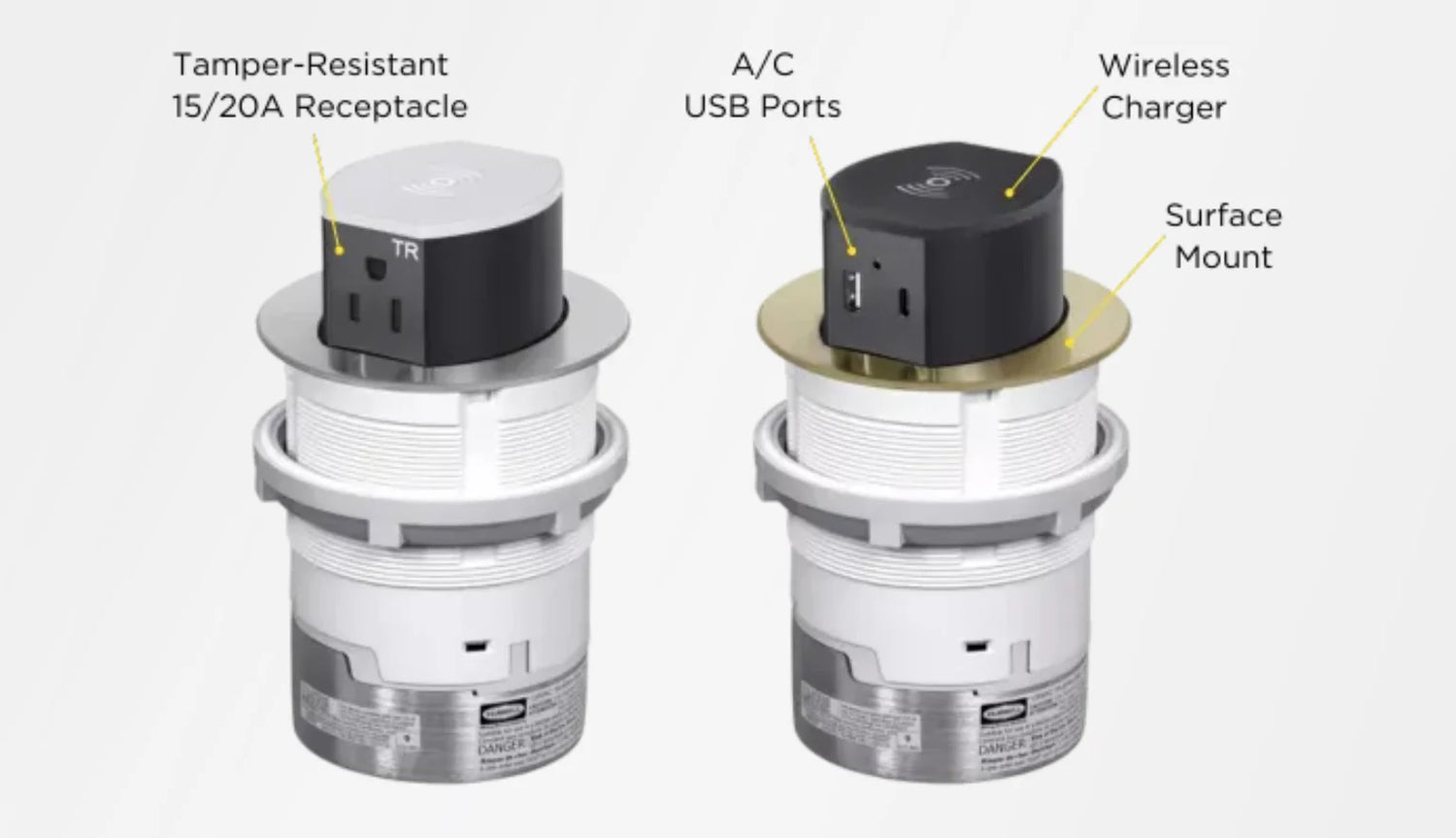 Built for durability and safety, these Pop-Up Receptacles are water-resistant, tested to withstand spills of up to half a gallon. They also feature Hubbell’s patent-pending silicone gaskets and innovative, patented cam-action tamper-resistant technology. The low-profile, space-saving design minimizes impact both on the countertop surface and within the cabinet below, making installation seamless and unobtrusive.